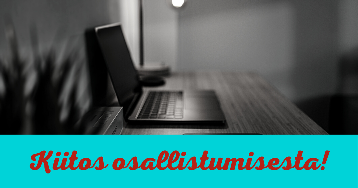 Jokaisen osallistujan sähköpostiin on lähtenyt kiitosviesti, jonka yhteydessä on linkki palautekyselyyn. Lomake on auki tiistaihin 5.10. klo 23.59 asti. Tarkistathan roskapostikansiosi, jos et ole saannut viestiä! Pääset suoraan kyselyyn myös tästä linkistä.