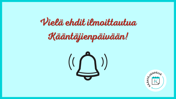 Enää kaksi viikkoa aikaa ilmoittautua mukaan Kääntäjienpäivään 2023 paikan päälle Tampereelle! Paikat lähitapahtumassa käyvät vähiin, joten kiiruhda viimeistään nyt ilmoittautumaan … Lisää